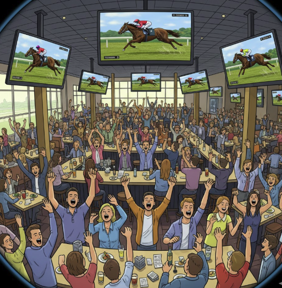 Low-latency streams create near-real-time horse race viewing across 10 venues, paired with local MCs, offline gamification, and overlay Ads for sponsor visibility and attendees excitement.